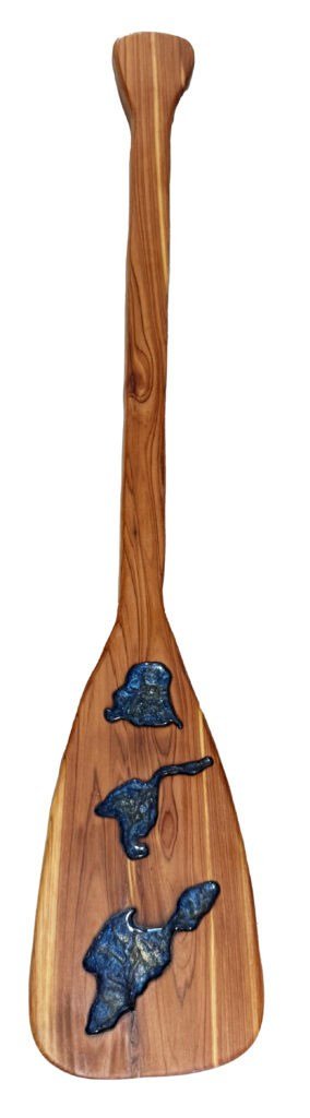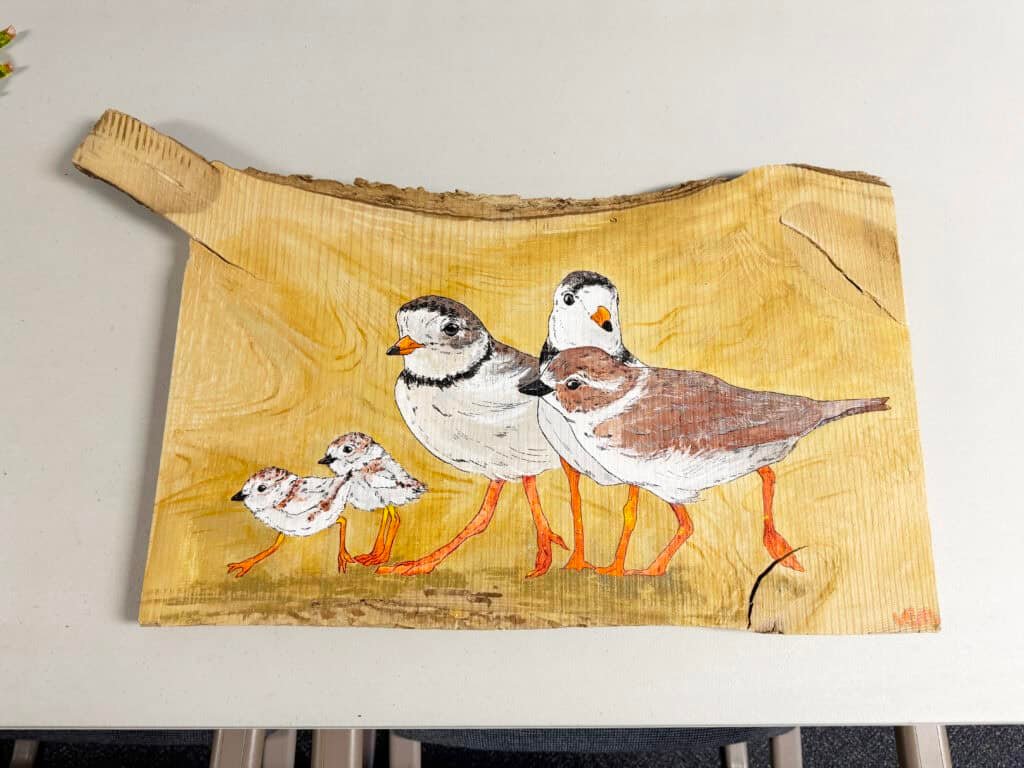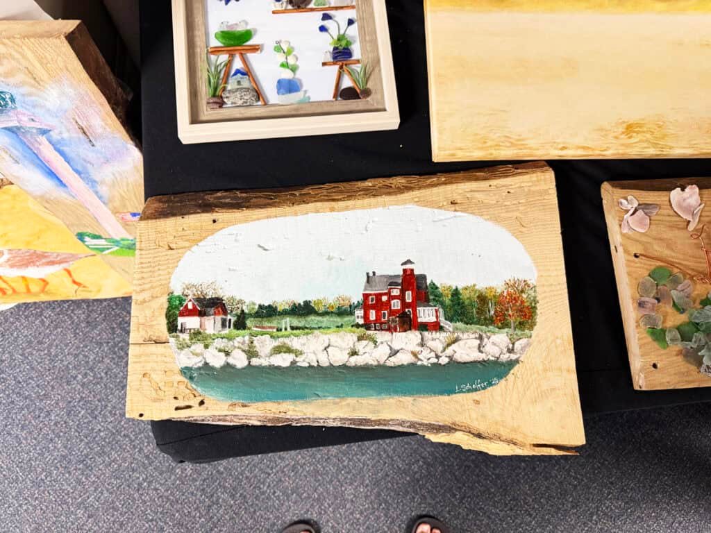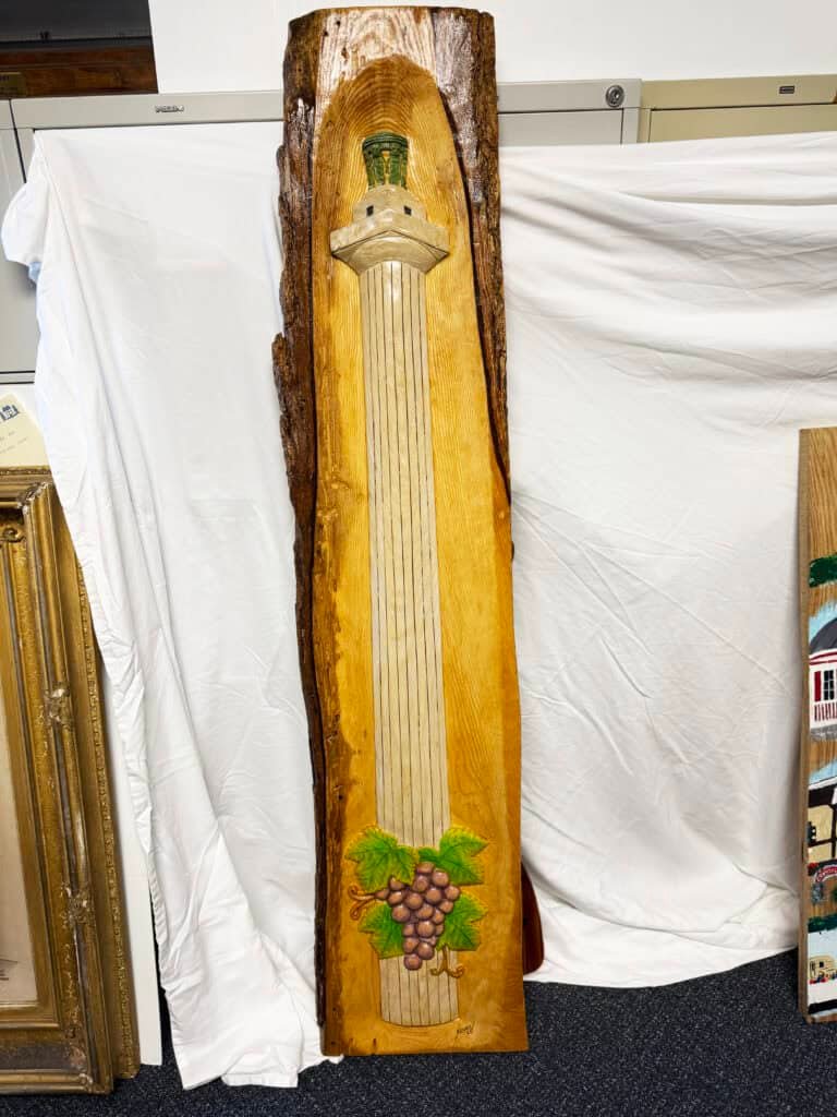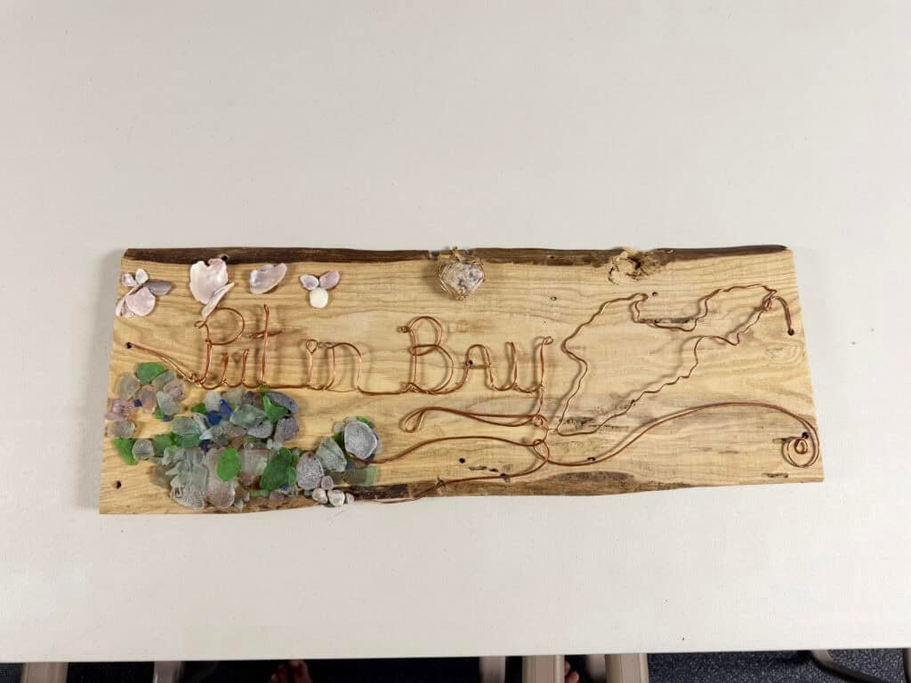 Artists used wood from an ash tree at the Cliff House. The overall theme is Put-in-Bay and/or Lake Erie Island related.